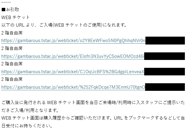 「購入完了メールに記載のあるURLがWEBチケットのURLとなります。ご家族やご友人などに共有する際は<URLをコピーしていただき>メールやLINEなどで送信してください。